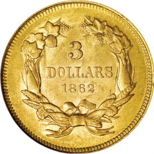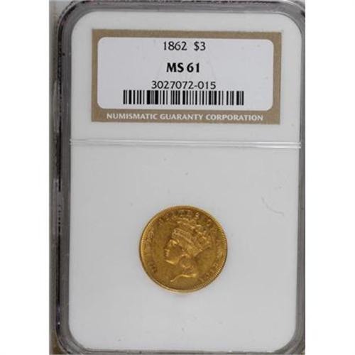 <B>1862 $3 MS61 NGC.</B></I> A high-end survivor from this Civil War odd-denomination issue, which has a mintage of just 5,750 business strikes. The yellow-orange piece offered here is luminous with pleasing detail, though the fields show myriad scattered abrasions that contribute to the grade. Census: 15 in 61, 28 finer (8/07).<BR><BR><B>Coin Engraver:</B> James B. Longacre<BR><BR><b>Shipping:</b> Coins & Currency (<a target="_blank" href="http://www.heritageauctions.com/common/shipping.php">view shipping information</a>)
