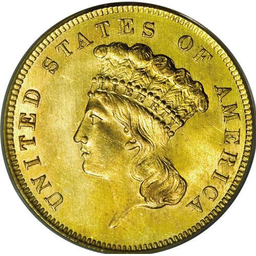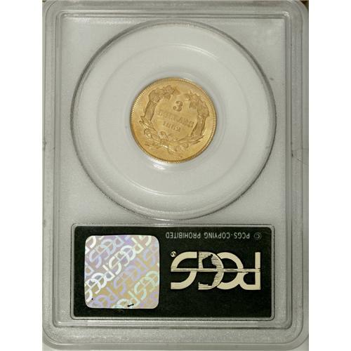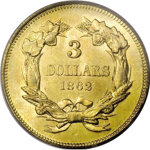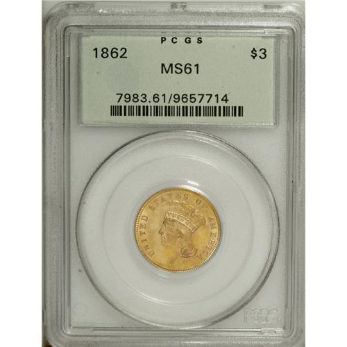 <B>1862 $3 MS61 PCGS.</B></I> No clash marks appear on this example, unlike many survivors of this rare issue, but the vertical striations noted on both sides are typical. Considerable luster is present on the orange-gold surfaces, and a few light abrasions, none singularly distracting, define the grade. High-end for the assigned grade, quite appealing, and certified in a green-label holder. Population: 4 in 61, 28 finer (12/06).<BR><BR><b>Shipping:</b> Coin/Currency (<a target="_blank" href="http://www.heritageauctions.com/common/shipping.php">view shipping information</a>)