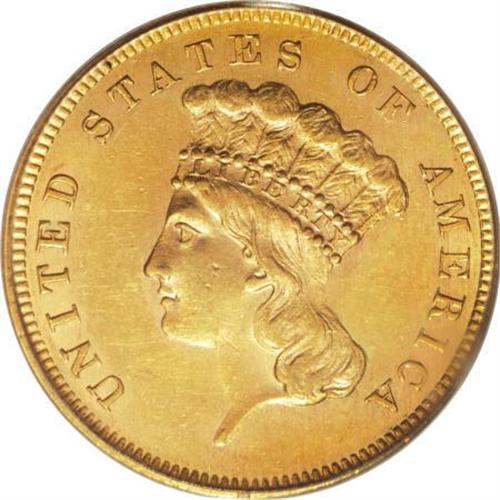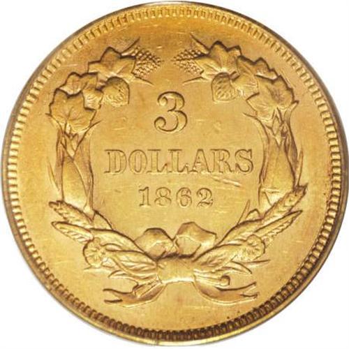 <B>1862 $3 MS62 PCGS.</B></I> A Civil War date with a mintage of a mere 5,750 pieces. Later dates in the series have an even lower productions, but they also have higher survival rates. Unlike the 1888, for example, the 1862 is rare in Mint State, with most examples in XF and AU grades. The present canary-gold piece is smooth aside from a minor mark beneath the R in DOLLARS. Population: 10 in 62, 24 finer (6/07).<BR><BR><B>Coin Engraver:</B> James B. Longacre<BR><BR><b>Shipping:</b> Coins & Currency (<a target="_blank" href="http://www.heritageauctions.com/common/shipping.php">view shipping information</a>\)