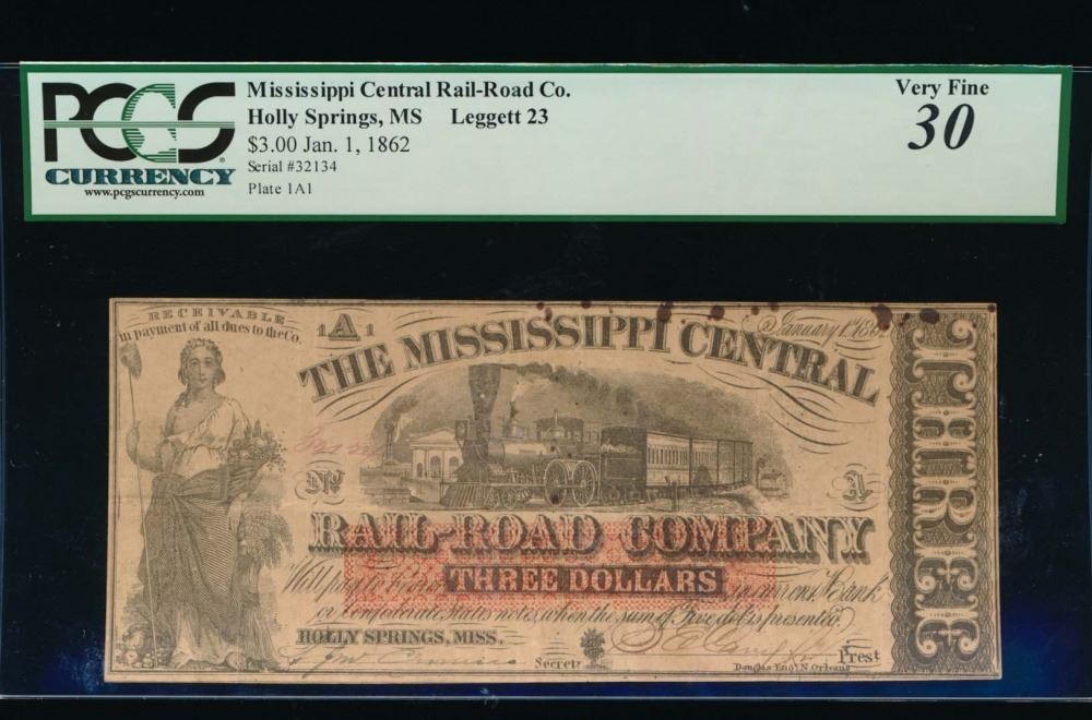 One 1862 $3 Rail Road Company Obsolete Note PCGS 30.