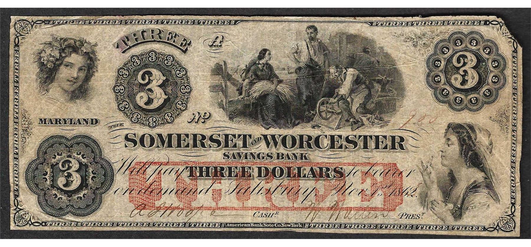 One 1862 $3 Somerset and Worcester Savings Bank Obsolete Note.