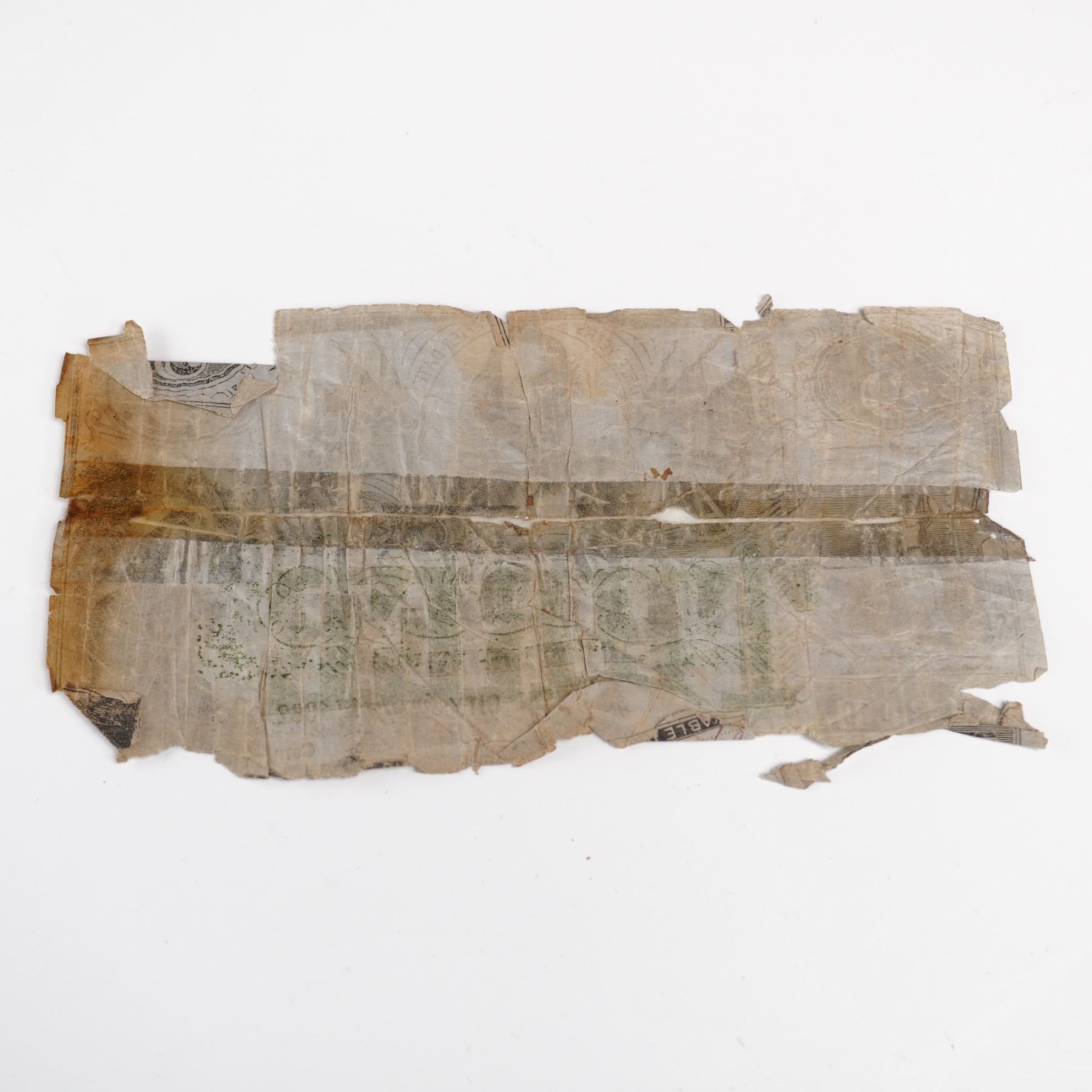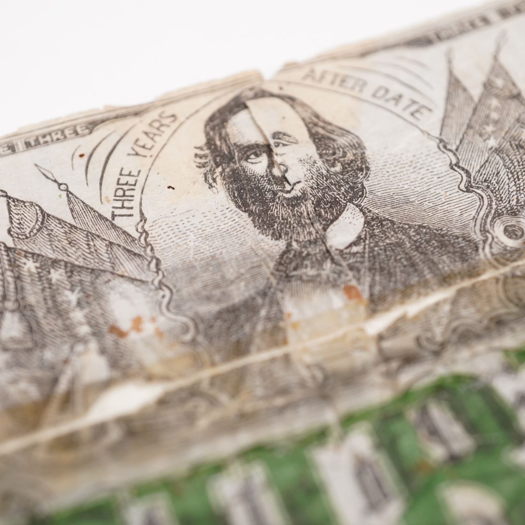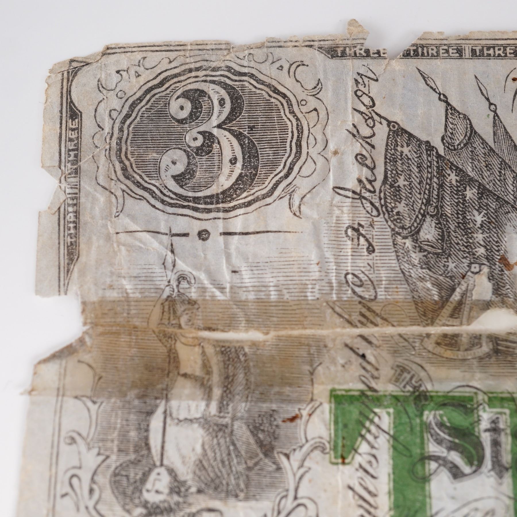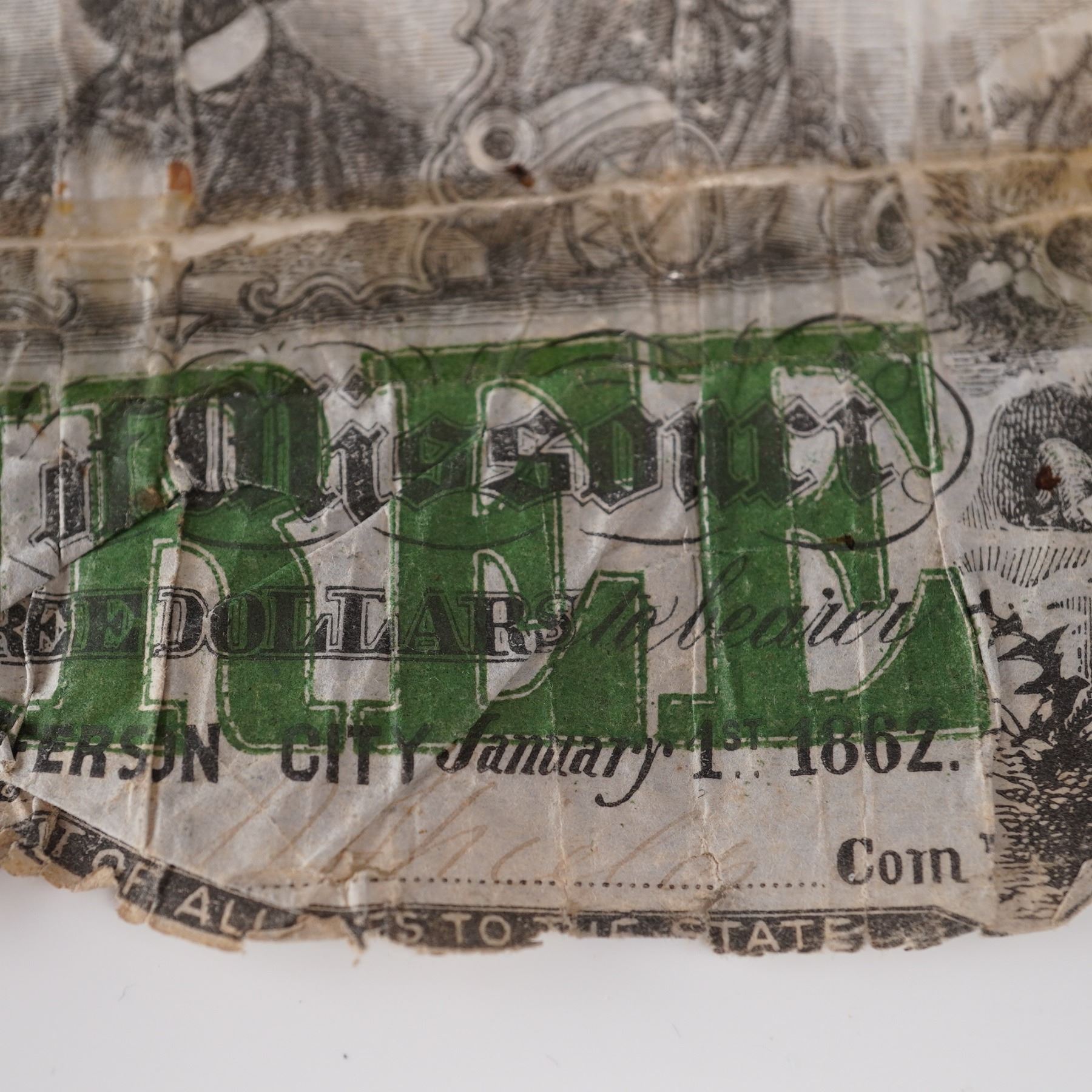 Original 1862 $3 banknote issued by the State of Missouri during the Civil War period. Dated January 1, 1862, this obsolete currency note features the denomination boldly overprinted in green with the word "THREE" at center. The top section presents a finely detailed engraved portrait of Governor Claiborne Fox Jackson, flanked by flags and symbolic allegorical figures. In the upper corners, the numeral "3" is prominently displayed, surrounded by ornamental border designs. The left vignette below the numeral depicts a standing allegorical female figure with spear and shield, while the lower portion of the note reads: "Jefferson City, January 1, 1862." and "The State of Missouri will pay THREE DOLLARS to bearer." This note was intended to be redeemable "Three Years After Date," as indicated around the portrait. Printed in a combination of black ink and green overprint, this piece of Confederate-era currency is an example of Missouri's emergency Civil War banking issues. The note shows significant wear consistent with age and circulation, with multiple fold lines, edge losses, stains, and paper thinning visible throughout. Partial handwritten numerals and inscriptions are still evident. A notable piece of American financial and Civil War history, reflective of Missouri's unique role as a border state issuing its own script during a time of economic strain and political division.