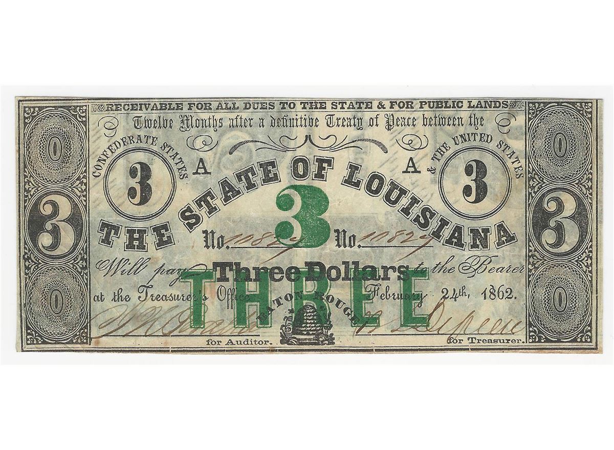 One 1862 $3 The State of Louisiana Obsolete Bank Note.
