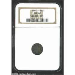 1862 3CS MS62 NGC. Iridescent toning fully envelopes both sides, with the obverse tending toward blue-green and russet, while the reverse is steel-blue with purple highlights. Specialists will want to carefully examine this very attractive coin to make their own determination of the potential for resubmission. Important notice: We expect to be auctioning lots at the rate of 200-250 per hour. Sometimes eBay Premier live bid software cannot keep up with that pace, so we strongly recommend that you place a realistic proxy bid now as insurance to avoid disappointment. Also please note that all Heritage/CAA lots purchased through eBay Premier carry a 20% Buyer's Premium. Please make sure you read the Terms and Conditions.