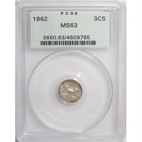 <B>1862 3CS MS63 PCGS.</B></I> PCGS Population (192/515). NGC Census: (140/622). Mintage: 343,000. Numismedia Wsl. Price for NGC/PCGS coin in MS63: $275. (#3680)<BR><BR><B>Coin Engraver:</B> James B. Longacre<BR><BR><b>Shipping:</b> Coins & Currency (<a target="_blank" href="http://www.heritageauctions.com/common/shipping.php">view shipping information</a>)