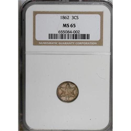 <B>1862 3CS MS65 NGC.</B></I> NGC Census: (224/117). PCGS Population (175/107). Mintage: 343,000. Numismedia Wsl. Price for NGC/PCGS coin in MS65: $900. (#3680)<BR><BR><B>Coin Engraver:</B> James B. Longacre<BR><BR><b>Shipping:</b> Coins & Currency (<a target="_blank" href="http://www.heritageauctions.com/common/shipping.php">view shipping information</a>)
