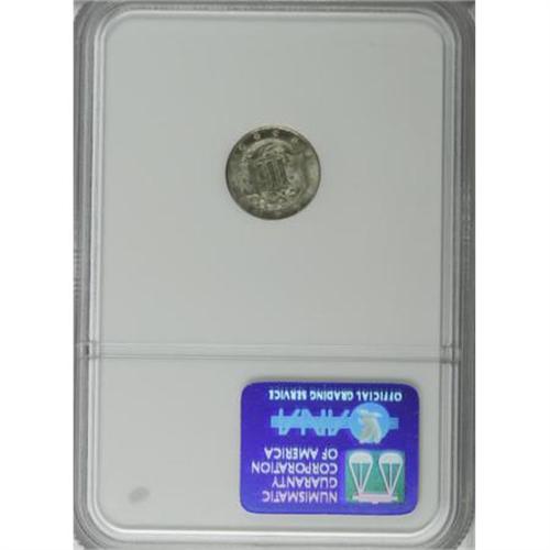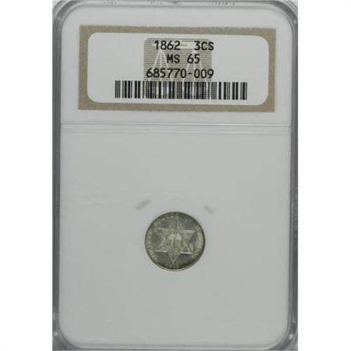 <B>1862 3CS MS65 NGC.</B></I> Soft, swirling luster characterizes this Gem trime, which hails from the last of the readily available business strike issues. Primarily silver-white with hints of green and gold near the rims.<BR><BR><B>Coin Engraver:</B> James B. Longacre<BR><BR><b>Shipping:</b> Coins & Currency (<a target="_blank" href="http://www.heritageauctions.com/common/shipping.php">view shipping information</a>)