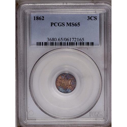 1862 3CS MS65 PCGS. Variegated cobalt-blue, lavender, 1862