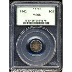 <B>1862<3CS> MS65 PCGS.</B></I> Deep multi-colored toning is dominated by medium-gray. Localized strike softness occurs on both sides, and the surfaces appear to be free from any significant marks. <BR><BR><B>Important notice:</B> Heritage usually auctions material at the rate of 200-250 lots per hour. On some occasions eBay Live bid software or the Internet may not be able to keep up with the pace of the auction. We recommend placing a realistic absentee bid now as insurance to avoid disappointment. Occasionally the auctioneer may eliminate or reject an eBay Live bid, and the auctioneer may also reopen a lot after the close of the eBay live bidding (usually because we missed an audience bid), and may reject your bid even if it shows you as the winning bidder. By bidding via eBay Live, you agree that Heritage may award the lot to another bidder at its sole discretion under the circumstances described above or any other reasonable circumstances. Since eBay bids are not shown to us until we open the lot on the floor, we treat those bids just like floor bids. In most cases the floor responds before the eBay bid is presented to us, due to Internet lag time, so for consistency we have made it a policy that floor bids are always considered first over tie eBay live bids. Also please note that all Heritage lots purchased through eBay Live carry a 20% Buyer's Premium. Please make sure you read the Terms and Conditions before you bid.