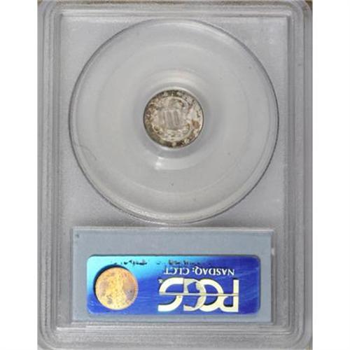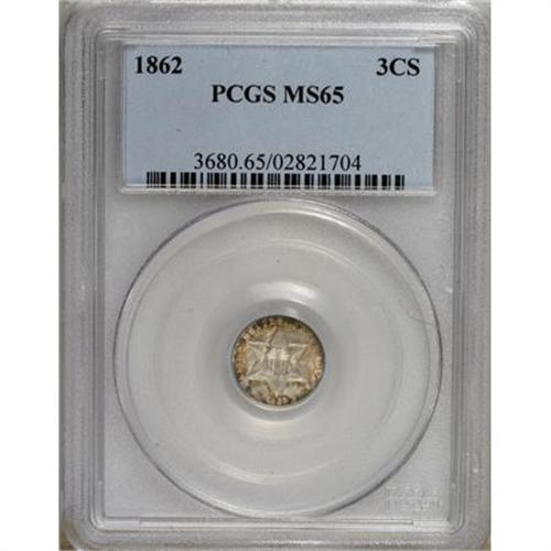 <B>1862 3CS MS65 PCGS.</B></I> Splotches of cobalt-blue, golden-tan, and lavender gravitate to the margins of this lustrous Gem trime. Generally well struck, save for the usual weakness in the reverse leaves. There are no significant marks to report.<BR><BR><b>Shipping:</b> Coins & Currency (<a target="_blank" href="http://www.heritageauctions.com/common/shipping.php">view shipping information</a>)
