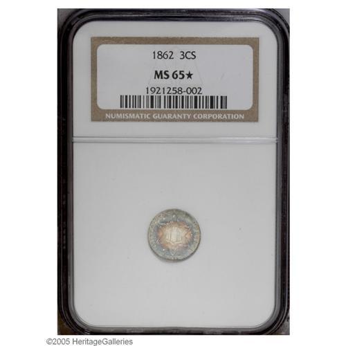 1862 3CS MS65 S NGC. Well struck from clashed dies, w 1862[3CS] MS65 [S NGC.