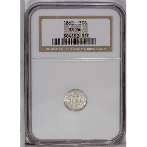<B>1862<3CS> MS66 NGC.</B></I> A boldly struck and essentially untoned example with attractive, frosty luster. A small spot of dark toning is noted on the T of UNITED.