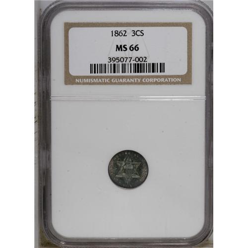 <B>1862 3CS MS66 NGC.</B></I> Sea-green and champagne-rose swirl about the well-preserved and somewhat reflective surfaces. Sharply struck from strongly clashed dies, a fact that scarcely diminishes this coin's eye appeal.<BR><BR><b>Shipping:</b> Coin/Currency (<a target="_blank" href="http://www.heritageauctions.com/common/shipping.php">view shipping information</a>)