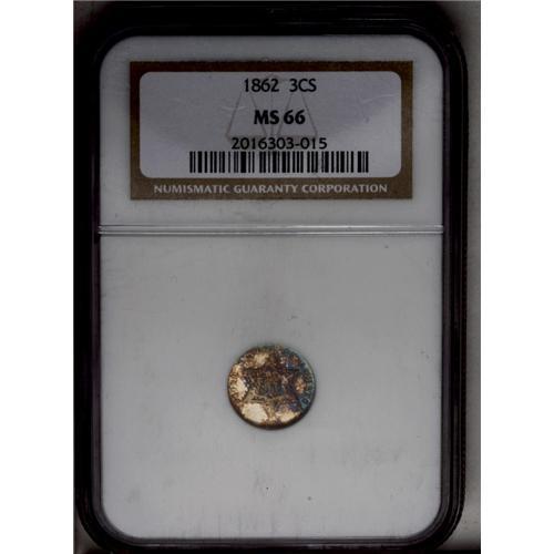 <B>1862<3CS> MS66 NGC.</B></I> Variegated toning in deep shades of steel-gray, gold, lavender and electric-blue rest upon virtually mark-free surfaces. The reverse luster is somewhat subdued by the depth of the toning.