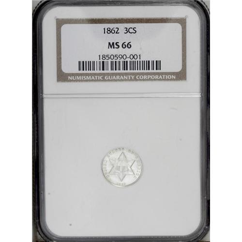 <B>1862<3CS> MS66 NGC.</B></I> Virtually untoned with frosty luster. A couple of tiny marks on the sharply detailed reverse keep this piece from reaching an even higher grade.