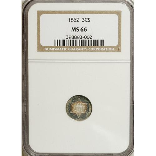 <B>1862 3CS MS66 NGC.</B></I> Waves of deep mauve, magenta, and cobalt-blue colors enrich this surprisingly well struck type coin. Well preserved with good luster, typical die clashing is seen on each side. The final relatively high mintage issue in the series, which had only token production from 1863 until its demise in 1873.<BR><BR><b>Shipping:</b> Coins & Currency (<a target="_blank" href="http://www.heritageauctions.com/common/shipping.php">view shipping information</a>)