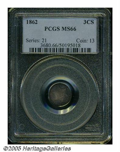 <B>1862<3CS> MS66 PCGS.</B></I> Sharply struck with dark turquoise-green and deep purple-rose toning, on both obverse and reverse, with expertly preserved, unblemished surfaces and the absence of die clashing. A highly lustrous, lovely Type Three trime, in premium Gem condition. Population: 86 in 66, 11 finer (5/05).