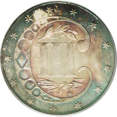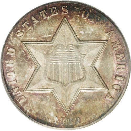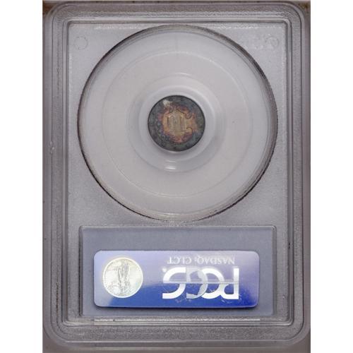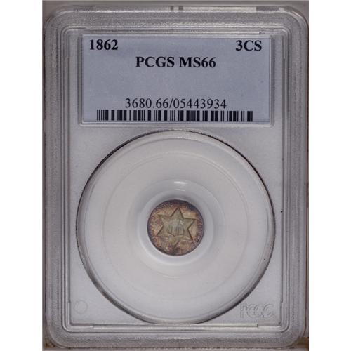 <B>1862<3CS> MS66 PCGS.</B></I> This Civil War Premium Gem is beautifully toned in iridescent ruby-red, olive, and sea-green hues. The fields are moderately prooflike, and are void of contact although mint-made clashmarks are noted. Well struck throughout the borders although the centers are typically delivered by the dies.