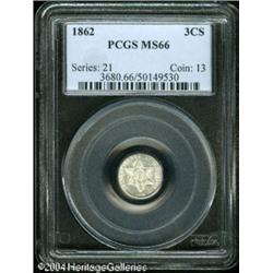 1862 3CS MS66 PCGS. This Civil War issue possesses <B>1862 3CS MS66 PCGS.</B></I> This Civil War issue possesses white, lustrous surfaces. The design elements are generally adequately impressed, except for softness in the center of the horizontal shield lines, in the center cluster of reverse leaves, in the arrow feathers, and in a couple of star centers. A few minute marks are noted on the uprights of the III. Population: 93 in 66, 11 finer (10/04). <BR><BR><B>Important notice:</B> Heritage usually auctions material at the rate of 200-250 lots per hour. On some occasions eBay Live bid software or the Internet may not be able to keep up with the pace of the auction. We recommend placing a realistic absentee bid now as insurance to avoid disappointment. Occasionally the auctioneer may eliminate or reject an eBay Live bid, and the auctioneer may also reopen a lot after the close of the eBay live bidding (usually because we missed an audience bid), and may reject your bid even if it shows you as the winning bidder. By bidding via eBay Live, you agree that Heritage may award the lot to another bidder at its sole discretion under the circumstances described above or any other reasonable circumstances. Since eBay bids are not shown to us until we open the lot on the floor, we treat those bids just like floor bids. In most cases the floor responds before the eBay bid is presented to us, due to Internet lag time, so for consistency we have made it a policy that floor bids are always considered first over tie eBay live bids. Also please note that all Heritage lots purchased through eBay Live carry a 20% Buyer's Premium. Please make sure you read the Terms and Conditions before you bid. This lot is being auctioned in conjunction with a live floor auction by Heritage Galleries & Auctioneers. All final auction and invoice information will be supplied by Heritage Galleries & Auctioneers, and all other information should be considered preliminary. Lot:5478