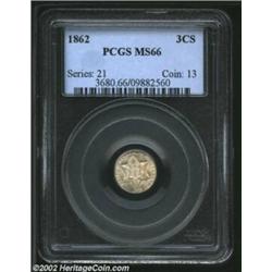 1862 3CS MS66 PCGS. This shimmering Gem exhibits frosty luster that is fully brilliant save for a couple of hints of light iridescent gold in the peripheries. Only a few tiny abrasions are visible even beneath magnification, and the obverse bears interesting clash marks. Important notice: We expect to be auctioning lots at the rate of 200-250 per hour. Sometimes eBay Premier live bid software cannot keep up with that pace, so we strongly recommend that you place a realistic proxy bid now as insurance to avoid disappointment. Also please note that all Heritage/CAA lots purchased through eBay Premier carry a 20% Buyer's Premium. Please make sure you read the Terms and Conditions.