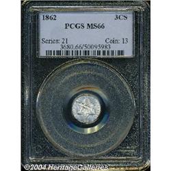 <B>1862<3CS> MS66 PCGS.</B></I> This gorgeous Type Three example is virtually untoned and fully lustrous, sharply struck throughout save for a touch of softness in the center area of the obverse design and on a couple of the stars, and devoid of any major abrasions. Population: 90 in 66, 11 finer (9/04). <BR><BR><B>Important notice:</B> Heritage usually auctions material at the rate of 200-250 lots per hour. On some occasions eBay Live bid software or the Internet may not be able to keep up with the pace of the auction. We recommend placing a realistic absentee bid now as insurance to avoid disappointment. Occasionally the auctioneer may eliminate or reject an eBay Live bid, and the auctioneer may also reopen a lot after the close of the eBay live bidding (usually because we missed an audience bid), and may reject your bid even if it shows you as the winning bidder. By bidding via eBay Live, you agree that Heritage may award the lot to another bidder at its sole discretion under the circumstances described above or any other reasonable circumstances. Since eBay bids are not shown to us until we open the lot on the floor, we treat those bids just like floor bids. In most cases the floor responds before the eBay bid is presented to us, due to Internet lag time, so for consistency we have made it a policy that floor bids are always considered first over tie eBay live bids. Also please note that all Heritage lots purchased through eBay Live carry a 20% Buyer's Premium. Please make sure you read the Terms and Conditions before you bid.