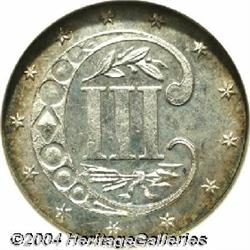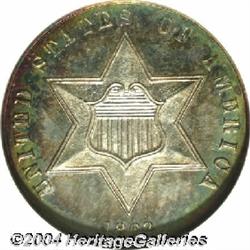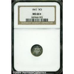 <B>1862<3CS> MS66 <S NGC.</B></I> Many three cent silver pieces show a profound lack of highpoint detail, a generalization that this piece does not follow. Crisply defined throughout, the shield, the peripheral stars, the olive leaves, and the arrows are all strongly struck. Another generalization this coin defies is the "darkly toned" expectation most collectors have of this series. Both sides are light, almost brilliant in the centers, with light iridescence around the peripheries. Exceptionally clean throughout, this is a type coin worth stretching for. <BR><BR><B>Important notice:</B> Heritage usually auctions material at the rate of 200-250 lots per hour. On some occasions eBay Live bid software or the Internet may not be able to keep up with the pace of the auction. We recommend placing a realistic absentee bid now as insurance to avoid disappointment. Occasionally the auctioneer may eliminate or reject an eBay Live bid, and the auctioneer may also reopen a lot after the close of the eBay live bidding (usually because we missed an audience bid), and may reject your bid even if it shows you as the winning bidder. By bidding via eBay Live, you agree that Heritage may award the lot to another bidder at its sole discretion under the circumstances described above or any other reasonable circumstances. Since eBay bids are not shown to us until we open the lot on the floor, we treat those bids just like floor bids. In most cases the floor responds before the eBay bid is presented to us, due to Internet lag time, so for consistency we have made it a policy that floor bids are always considered first over tie eBay live bids. Also please note that all Heritage lots purchased through eBay Live carry a 20% Buyer's Premium. Please make sure you read the Terms and Conditions before you bid.