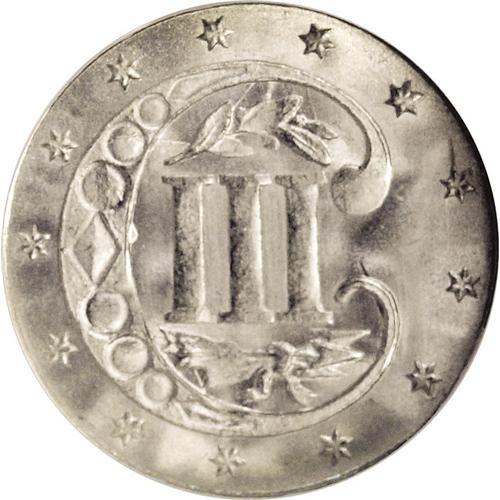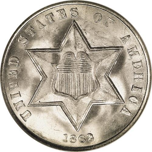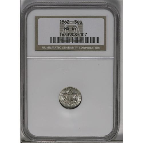 <B>1862<3CS> MS67 NGC.</B></I> A stone-white Superb Gem that displays bold clashmarks, but is virtually void of marks. A hint of striking softness on the centers precludes an even finer grade. This lustrous beauty would make a formidable contribution to a Civil War type set. Census: 18 in 67, 0 finer (6/06).<BR><I>From The Chief Paduke Collection.</B></I>