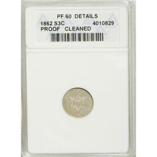 <B>1862 3CS --Cleaned--ANACS.</B></I> <B>PR60 Details. </B></I>NGC Census: (0/122). PCGS Population (4/175). Mintage: 550. Numismedia Wsl. Price for NGC/PCGS coin in PR60: $285. (#3711)<BR><BR><B>Coin Engraver:</B> James B. Longacre<BR><BR><b>Shipping:</b> Coins & Currency (<a target="_blank" href="http://www.heritageauctions.com/common/shipping.php">view shipping information</a>)