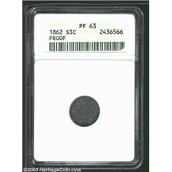 1862 3CS PR63 ANACS. Multicolored toning is evident on the faces of this attractive specimen, when it is turned beneath a light source. Otherwise, the deep toning on either side appears a very dark olive-brown. Some interesting die-clash marks can be seen among the three I's of the reverse Roman numerals. Important notice: We expect to be auctioning lots at the rate of 200-250 per hour. On occasion eBay live bid software cannot keep up with the pace of the auctions where 4-5 lots per minute can hammer down, so we recommend that you place a realistic absentee bid now as insurance to avoid disappointment. Also please note that all Heritage/CAA lots purchased through eBay Live carry a 20% Buyer's Premium. Please make sure you read the Terms and Conditions.