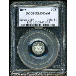<B>1862<3CS> PR63 Cameo PCGS.</B></I> This essentially untoned Proof has just a tiny splash of gold along the reverse rim at 11 o'clock. The devices are fully lustrous and are framed by deeply mirrored fields. <BR><BR><B>Important notice:</B> Heritage usually auctions material at the rate of 200-250 lots per hour. On some occasions eBay Live bid software or the Internet may not be able to keep up with the pace of the auction. We recommend placing a realistic absentee bid now as insurance to avoid disappointment. Occasionally the auctioneer may eliminate or reject an eBay Live bid, and the auctioneer may also reopen a lot after the close of the eBay live bidding (usually because we missed an audience bid), and may reject your bid even if it shows you as the winning bidder. By bidding via eBay Live, you agree that Heritage may award the lot to another bidder at its sole discretion under the circumstances described above or any other reasonable circumstances. Since eBay bids are not shown to us until we open the lot on the floor, we treat those bids just like floor bids. In most cases the floor responds before the eBay bid is presented to us, due to Internet lag time, so for consistency we have made it a policy that floor bids are always considered first over tie eBay live bids. Also please note that all Heritage lots purchased through eBay Live carry a 20% Buyer's Premium. Please make sure you read the Terms and Conditions before you bid.