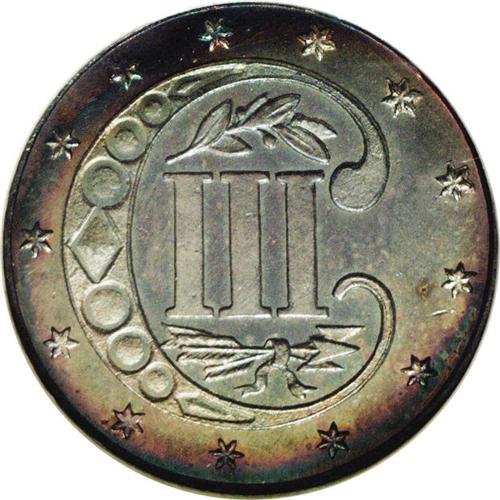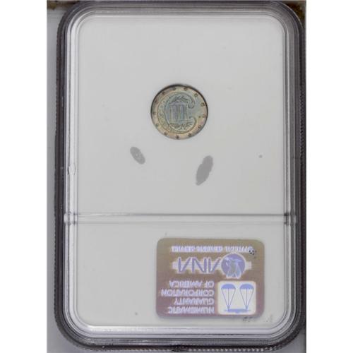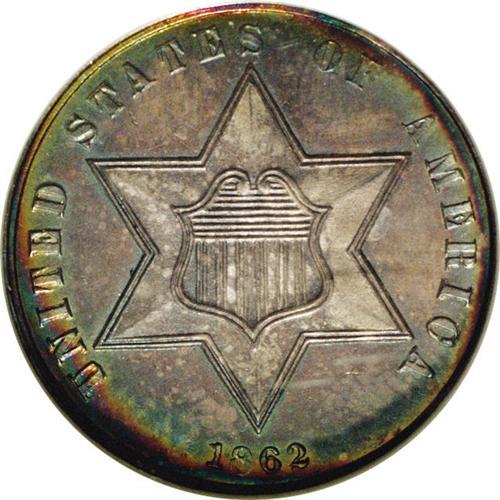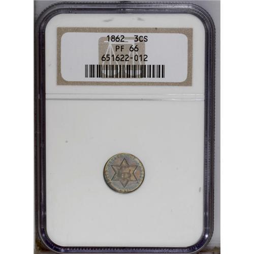 <B>1862<3CS> PR66 NGC.</B></I> Luscious deep rose-gray and electric-blue toning heightens the eye appeal of this smooth Premium Gem. Well struck with highly reflective fields and without noticeable clash marks. Some wispy contact marks in the right reverse field were obviously not regarded as significant by NGC, when they evaluated this scarce proof specimen. Census: 12 in 66, 5 finer (3/06). <BR><BR><B>Important notice:</B> Heritage usually auctions material at the rate of 200-250 lots per hour. On some occasions eBay Live bid software or the Internet may not be able to keep up with the pace of the auction. We recommend placing a realistic absentee bid now as insurance to avoid disappointment. Occasionally the auctioneer may eliminate or reject an eBay Live bid, and the auctioneer may also reopen a lot after the close of the eBay live bidding (usually because we missed an audience bid), and may reject your bid even if it shows you as the winning bidder. By bidding via eBay Live, you agree that Heritage may award the lot to another bidder at its sole discretion under the circumstances described above or any other reasonable circumstances. Since eBay bids are not shown to us until we open the lot on the floor, we treat those bids just like floor bids. In most cases the floor responds before the eBay bid is presented to us, due to Internet lag time, so for consistency we have made it a policy that floor bids are always considered first over tie eBay live bids. Also please note that all Heritage lots purchased through eBay Live carry a 20% Buyer's Premium. Please make sure you read the Terms and Conditions before you bid. This lot is being auctioned in conjunction with a live floor auction by Heritage Galleries & Auctioneers. All final auction and invoice information will be supplied by Heritage Galleries & Auctioneers, and all other information should be considered preliminary. Lot:769 <BR><BR><B>Winning Notification and Billing:</B> After the FINAL session in this auction is complete, Heritage will send e-mail and snail mail invoices. This process normally takes several days. All final auction and invoice information will be supplied by Heritage Galleries & Auctioneers, and all other information should be considered preliminary. <BR><BR>This auction will be conducted on a live auction floor and over the Internet through eBay Live. If you choose to place an absentee bid, please take a moment to <font color='#0000ff'><u><a href='http://pages.ebay.com/liveauctions/help/before/laabsentee.html'>learn how eBay Live absentee bidding works</a></u></font><font color='#000000'>