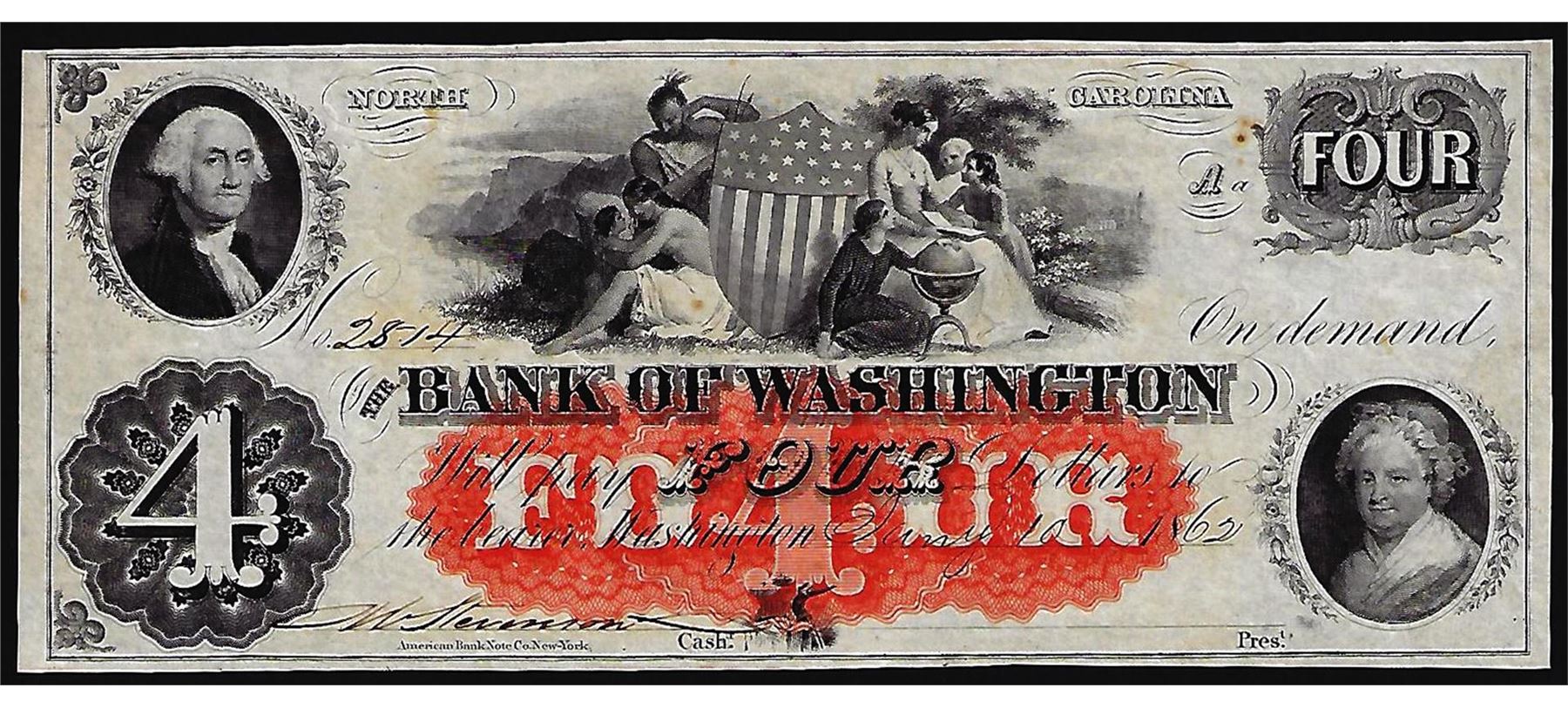 One 1862 $4 The Bank of Washington Obsolete Note.