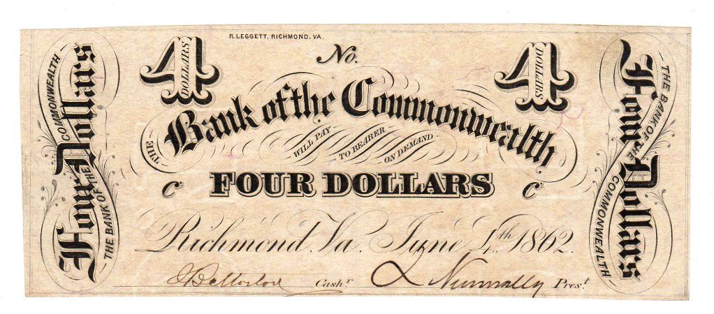 One 1862 $4 The Bank of the Commonwealth Obsolete Note.