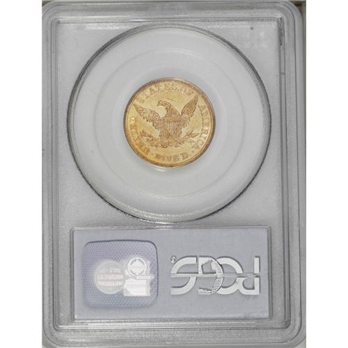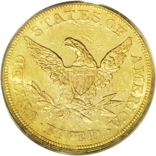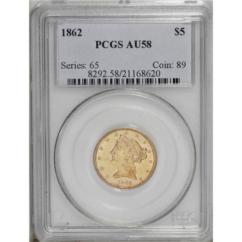 <B>1862<$5> AU58 PCGS.</B></I> Unsurprisingly for a coin of which only 4,430 business strikes were minted, this example shows much prooflikeness on both sides. There are many minuscule abrasions, but none are distracting or easily visible without a loupe, save for a couple of ticks in the left obverse field and one in back of the eagle's neck. The Garrett-Guth gold <I>Encyclopedia</B></I> comments of this issue, "The date is rarer than most of the Charlotte and Dahlonega issues of the 1840s and 1850s. Only about two dozen 1862 half eagles have crossed the auction block in the last two decades. Mint State examples of the date are very rare and underrated ... " The appealing surfaces are orange-gold, and the eye appeal is considerable. Another piece of equal quality and eye appeal might take many years to surface. Population: 2 in 58, 1 finer (9/06).