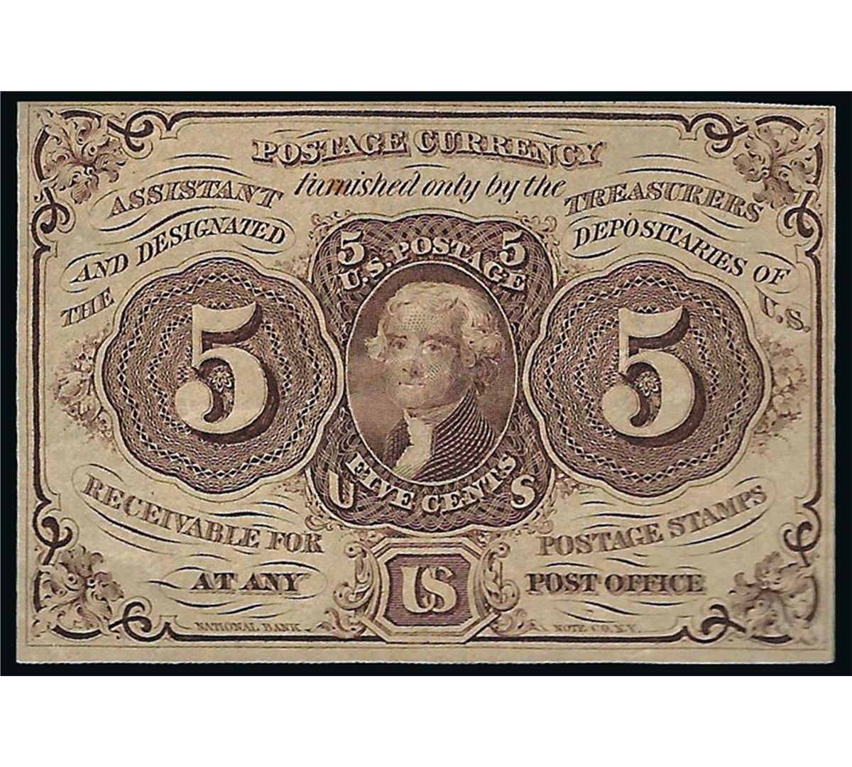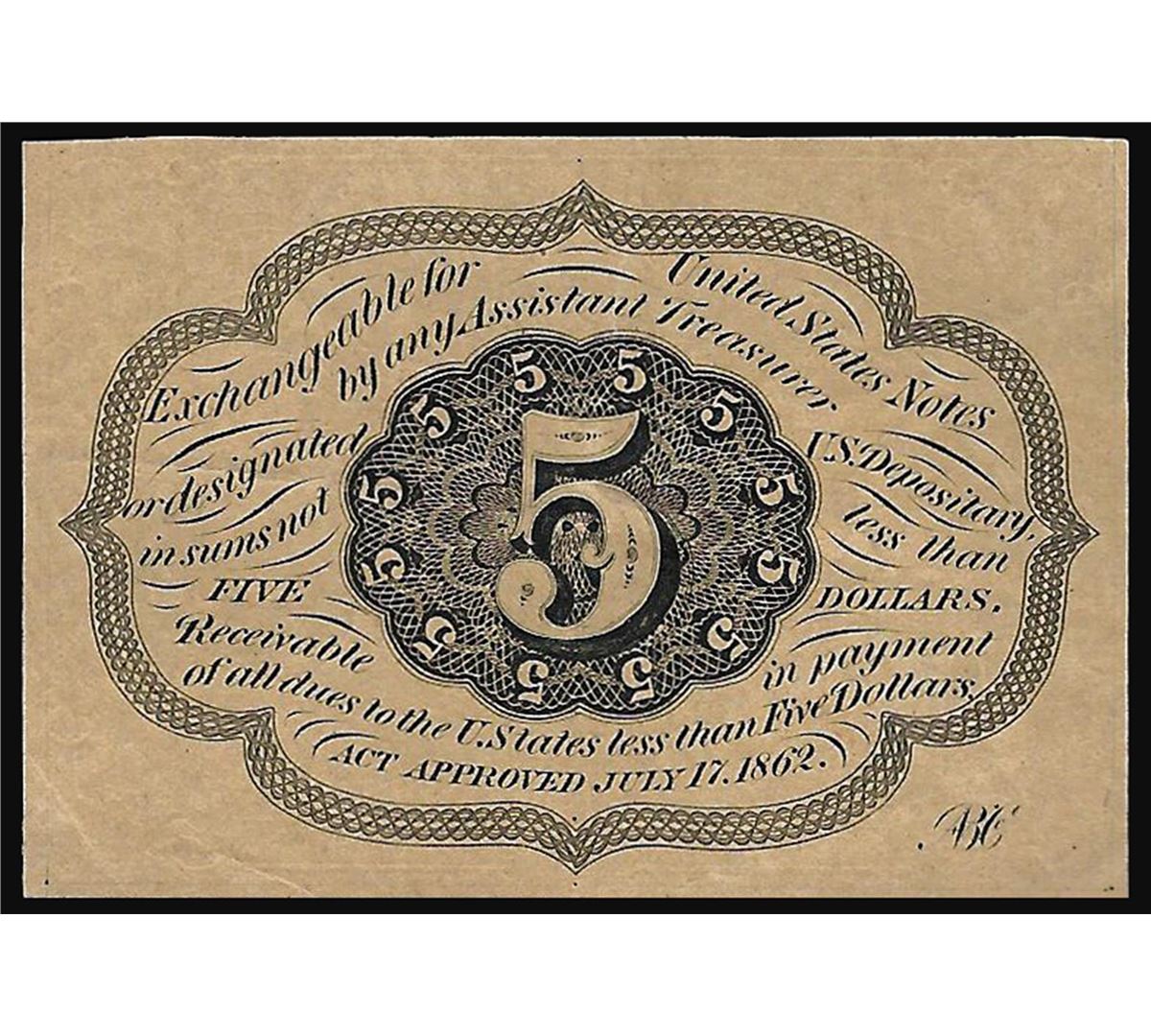 One 1862 5 Cent 1st Issue Fractional Note.