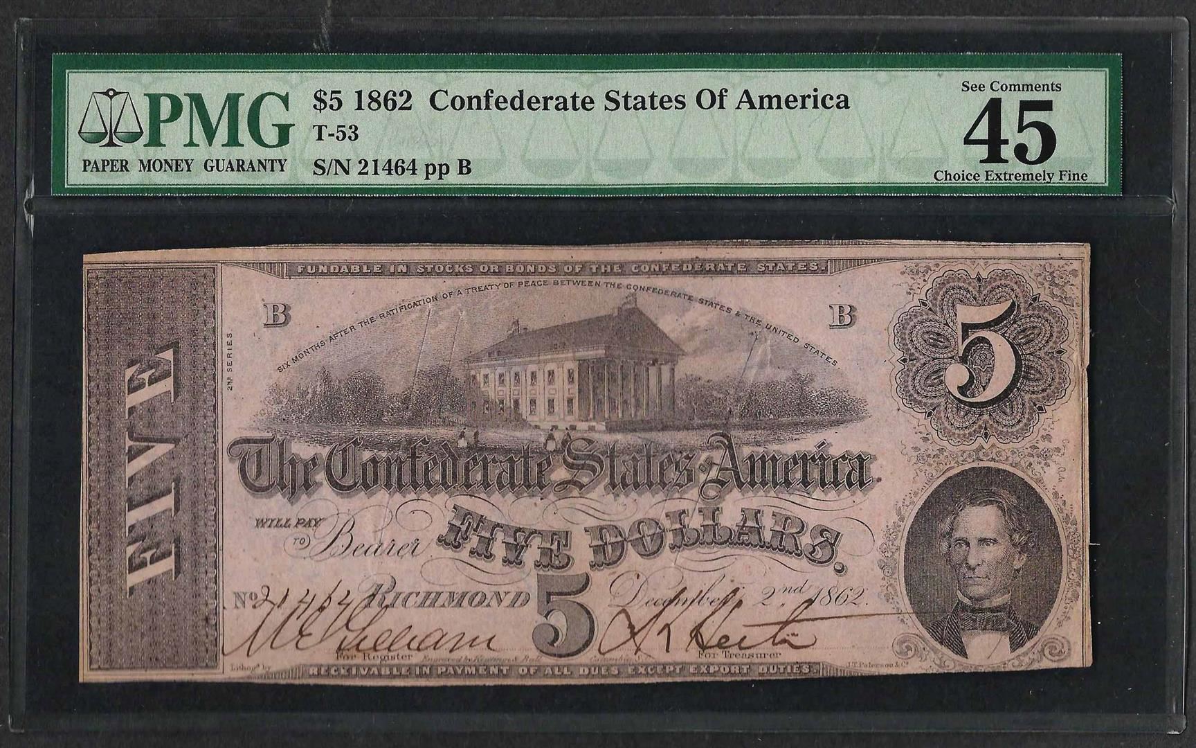 1862 $5 Confederate State of America Note T-53 PMG Choice Extremely Fine 45EPQ