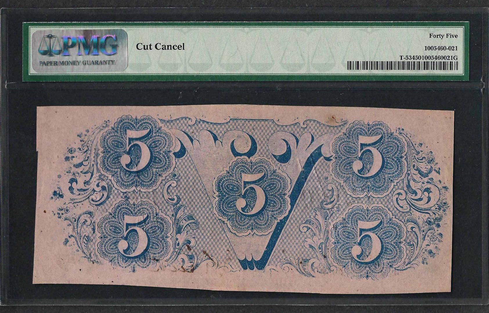 One 1862 $5 Confederate State of America Note T-53 PMG Choice Extremely Fine 45. PMG Certified.