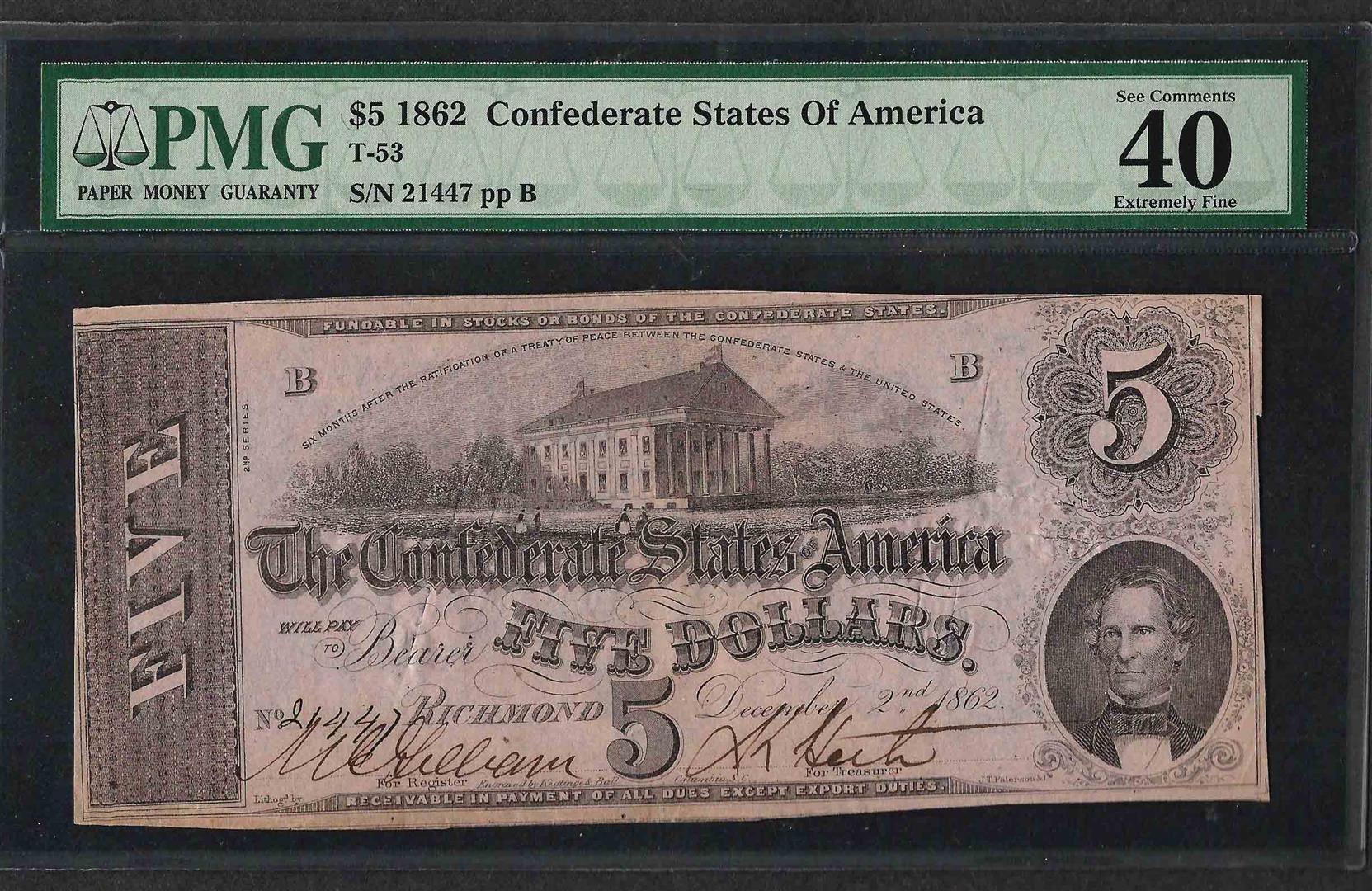 One 1862 $5 Confederate State of America Note T-53 PMG Extremely Fine 40. PMG Certified.