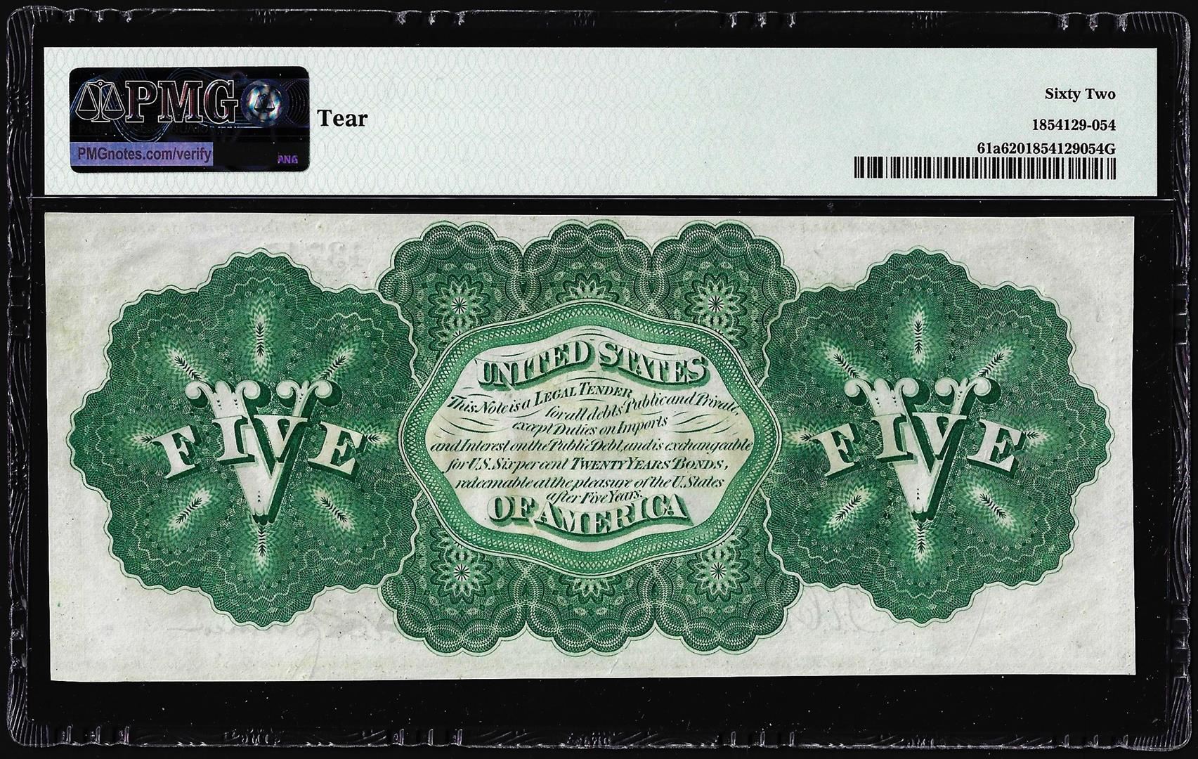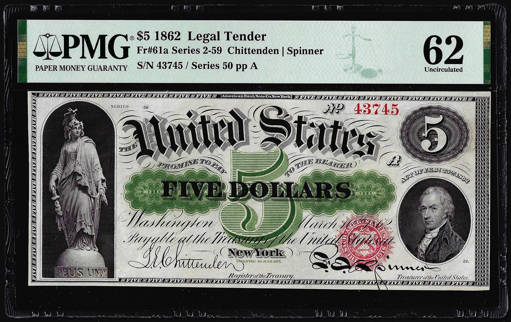 One 1862 $5 Legal Tender Note Fr.61a PMG Uncirculated 62. PMG Certified.