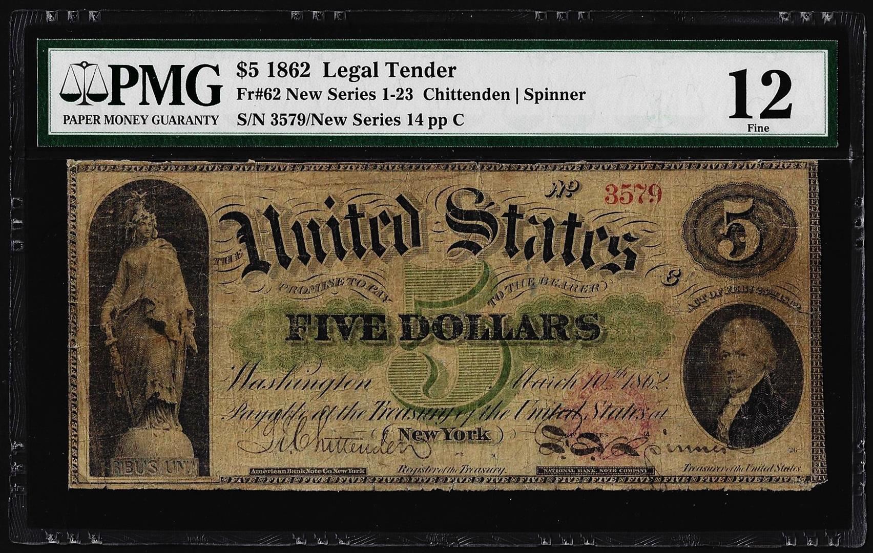 One 1862 $5 Legal Tender Note Fr.62 PMG Fine 12. PMG Certified.