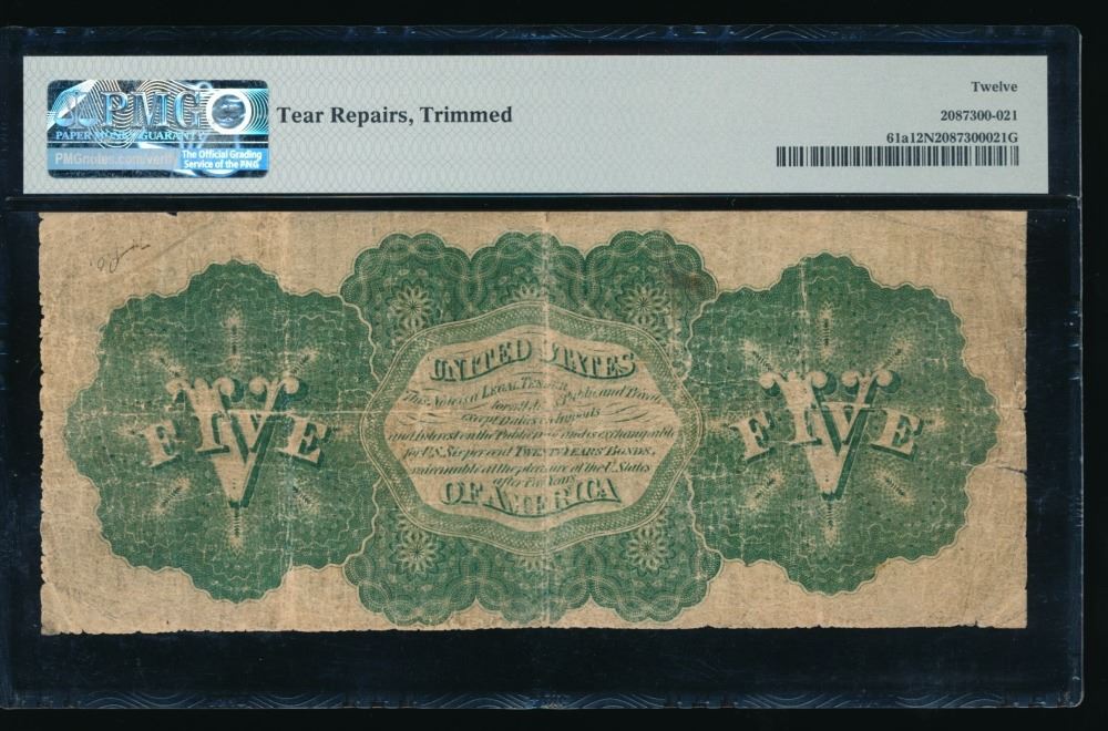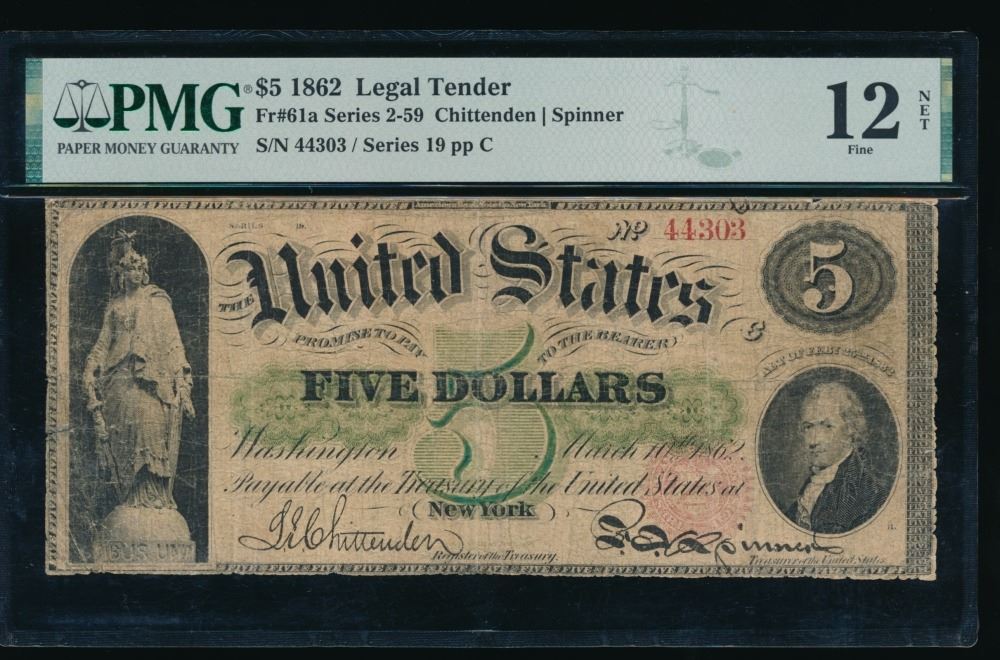 One 1862 $5 Legal Tender Note PMG 12NET.