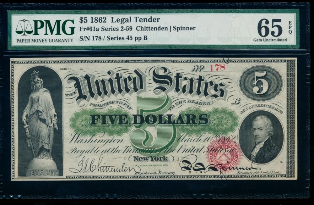 One 1862 $5 Legal Tender Note PMG 65EPQ.