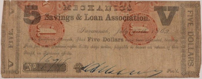1862 $5 MECHANICS SAVINGS & LOAN ASSOC. SAVANNAH, GA