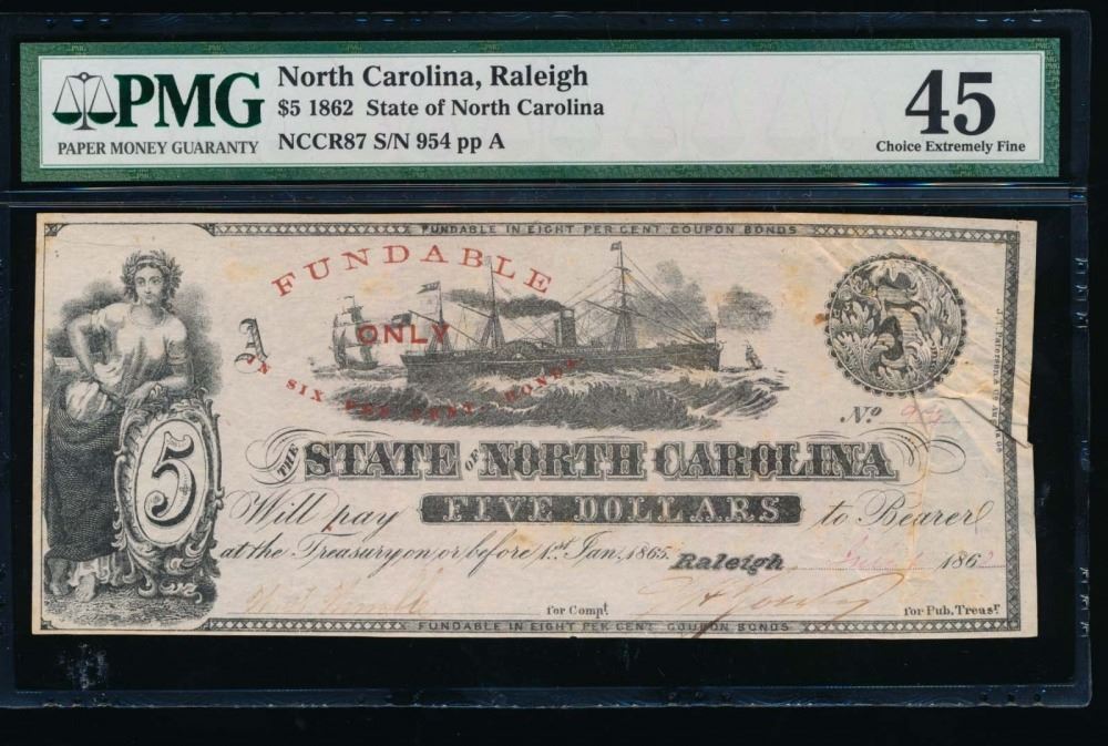 One 1862 $5 North Carolina Obsolete Note PMG 45.