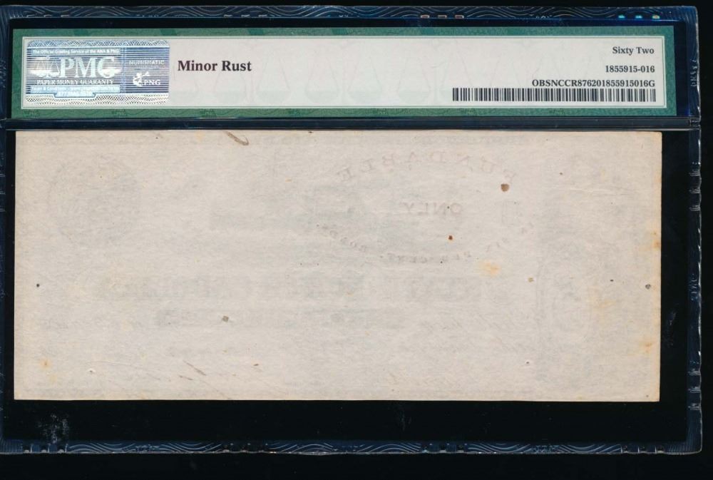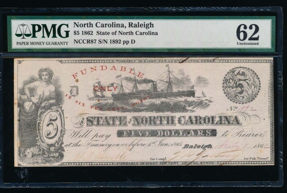 One 1862 $5 North Carolina Obsolete Note PMG 62.