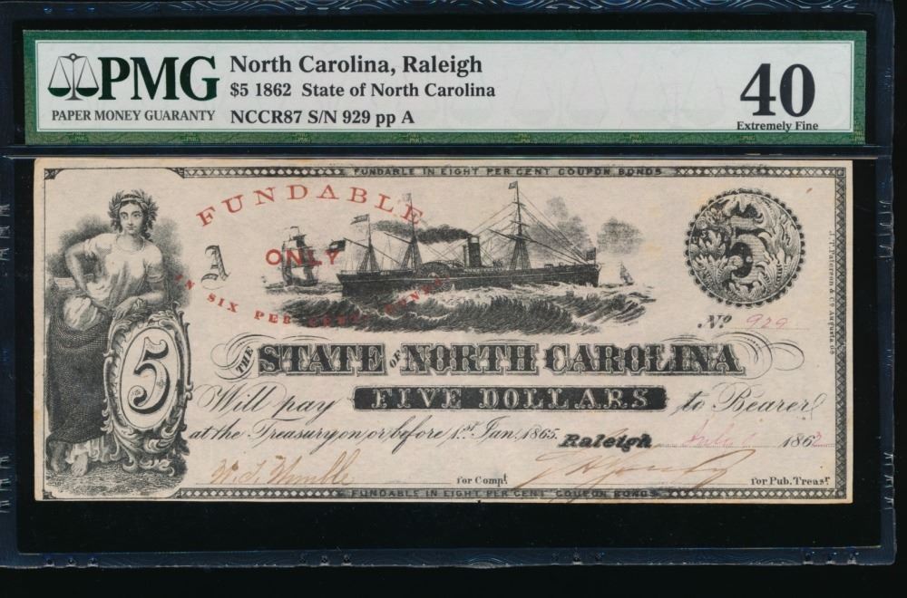 One 1862 $5 Radar Raleigh NC Obsolete Note PMG 40.