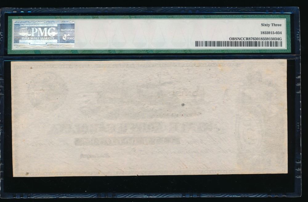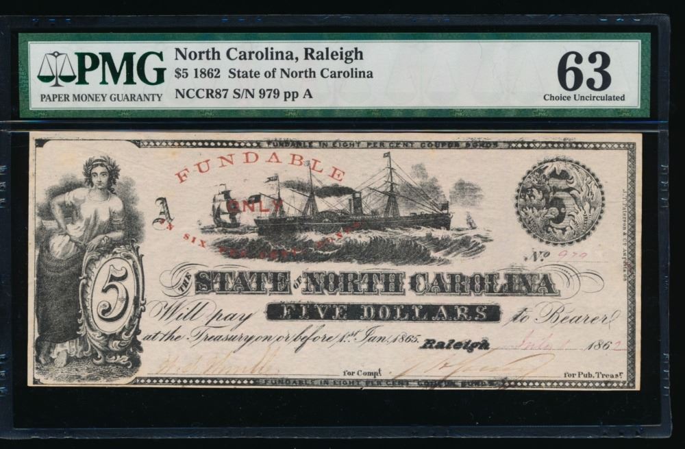 One 1862 $5 Radar Raleigh NC Obsolete Note PMG 63.