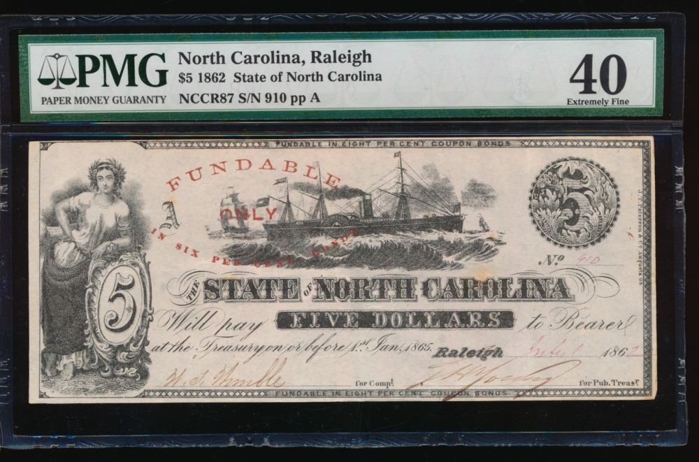One 1862 $5 Raleigh NC Obsolete Note PMG 40.