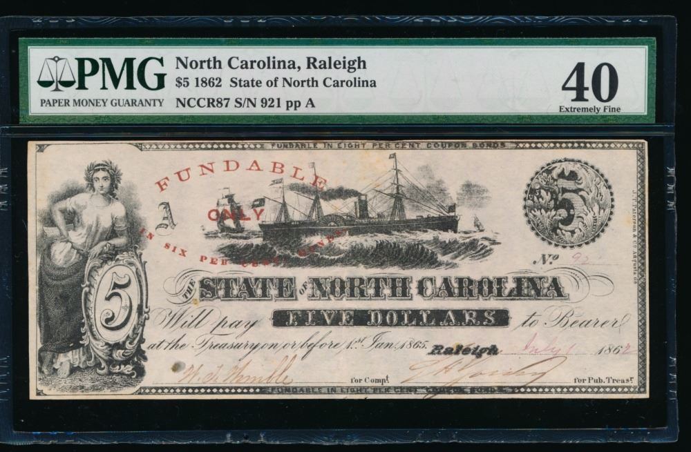 One 1862 $5 Raleigh NC Obsolete Note PMG 40.