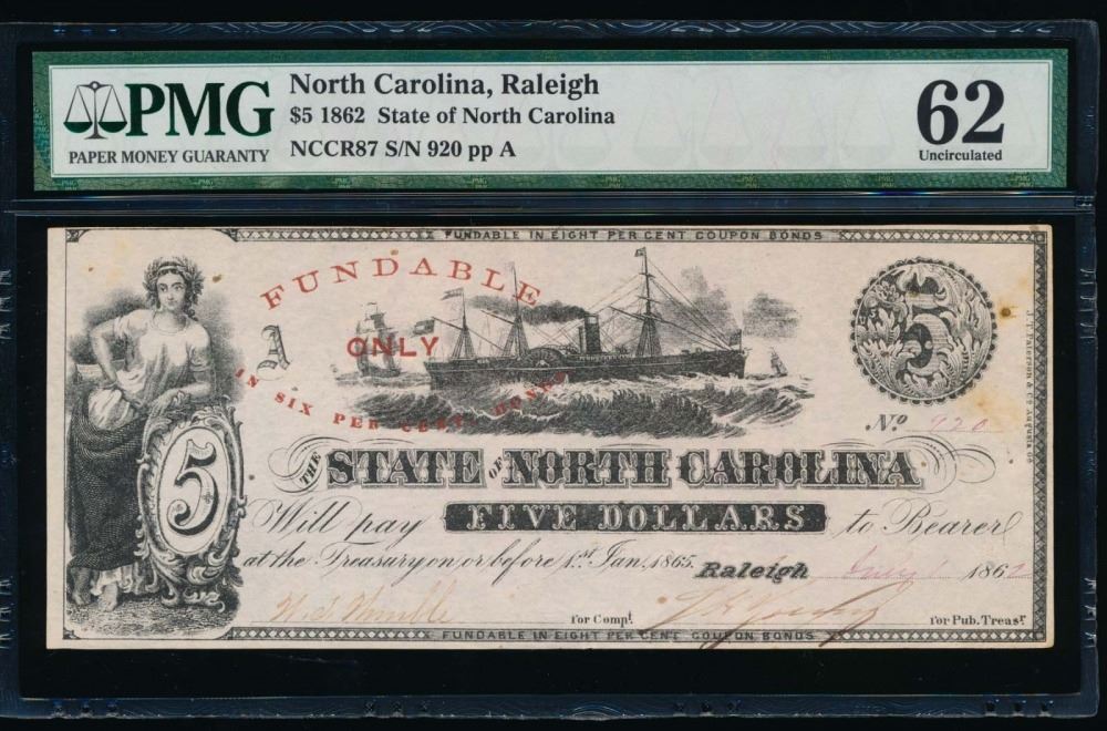 One 1862 $5 Raleigh NC Obsolete Note PMG 62.